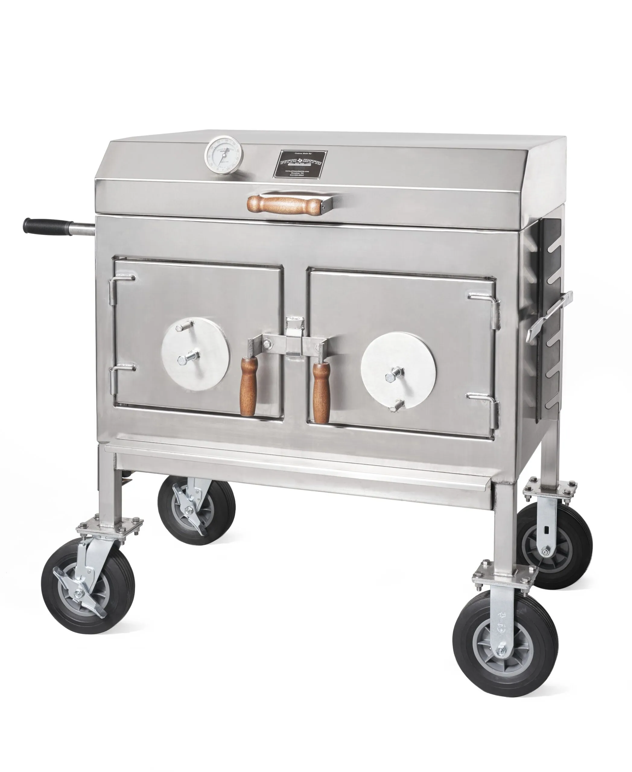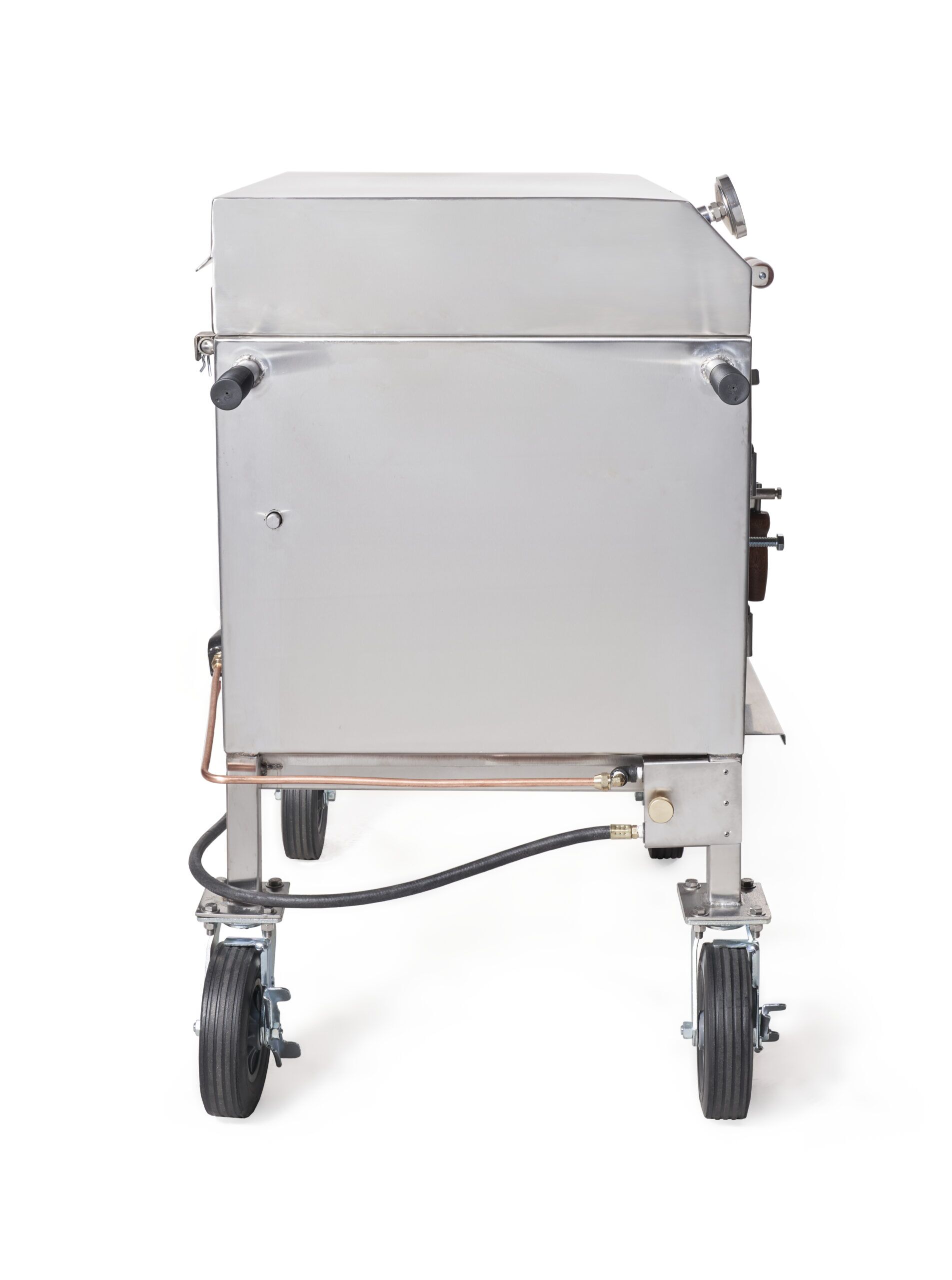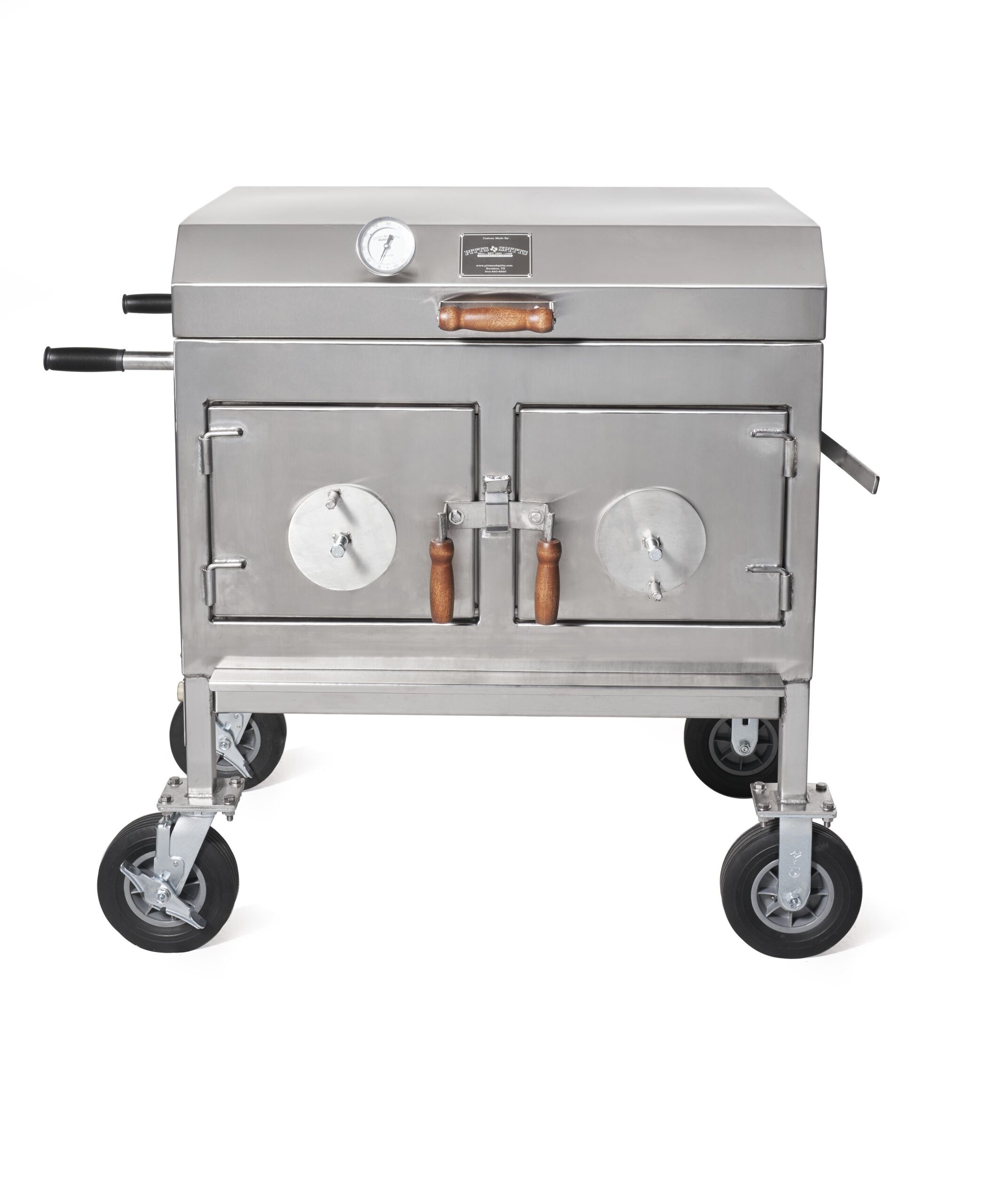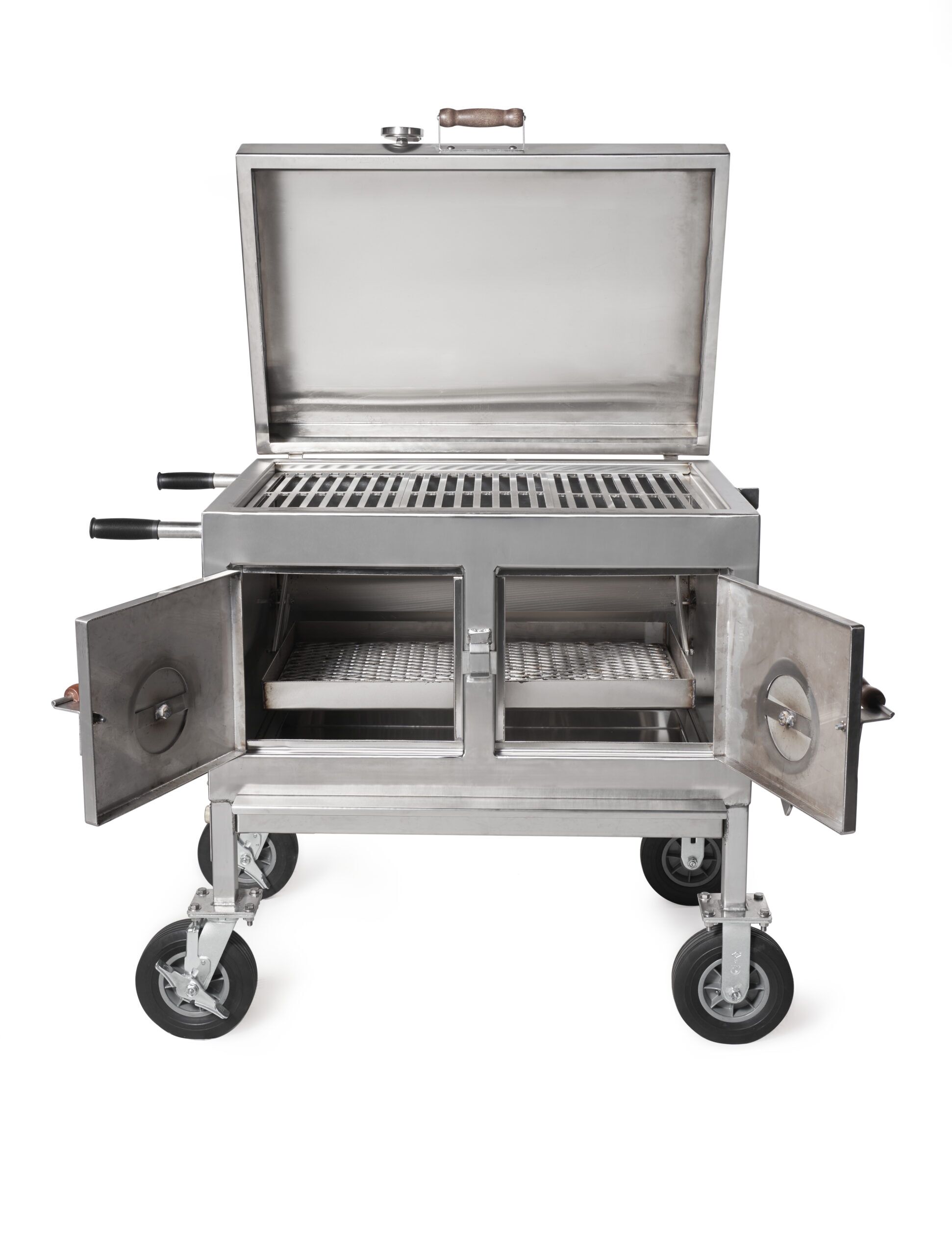 The carbon steel cooking chamber and fire chamber is made of 100% 304 Marine Grade 12 gauge stainless steel.