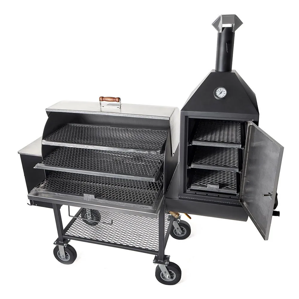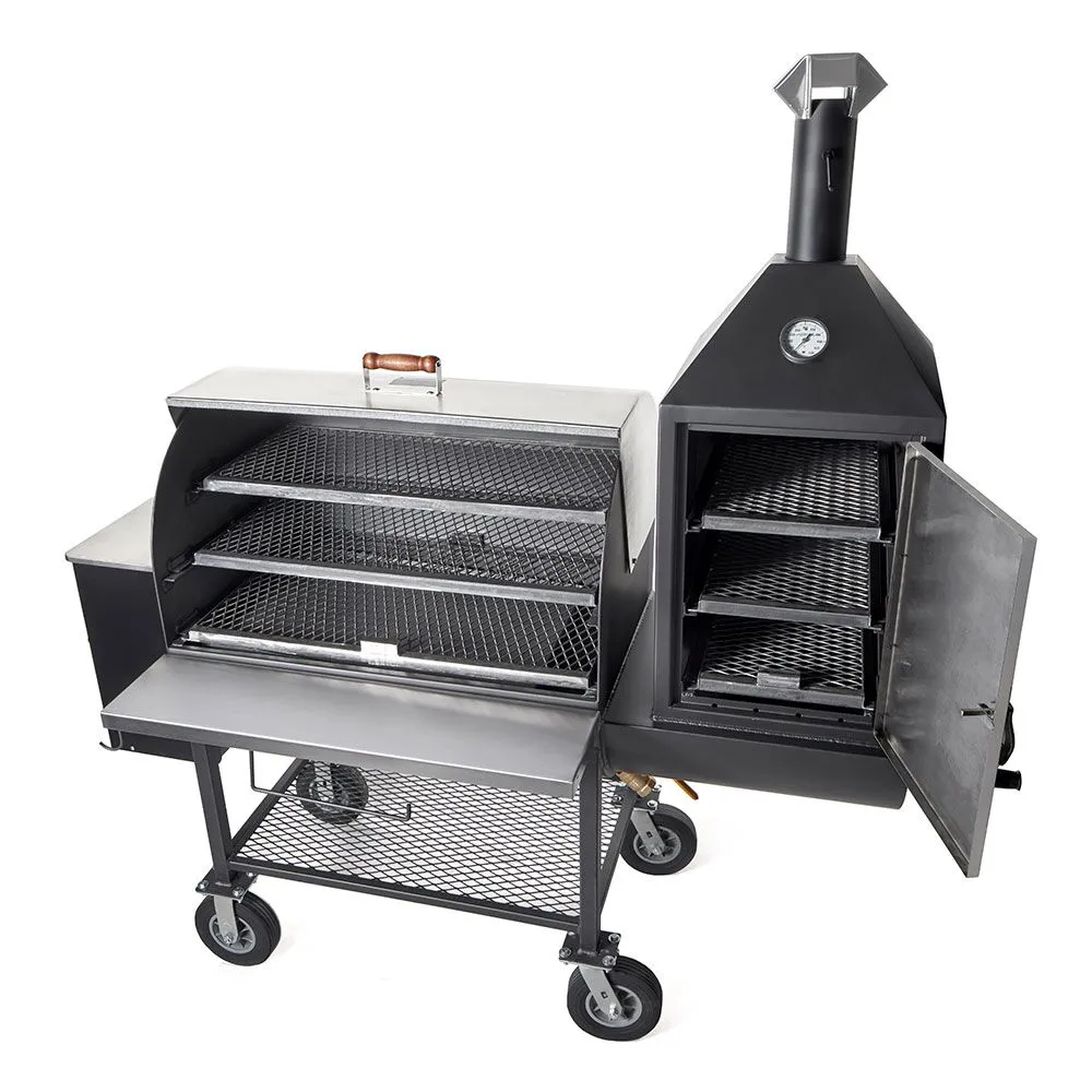 The carbon steel cooking chamber is made of 7 and 10 gauge carbon steel. This grill comes standard with our signature 304 stainless steel lid and work shelf.