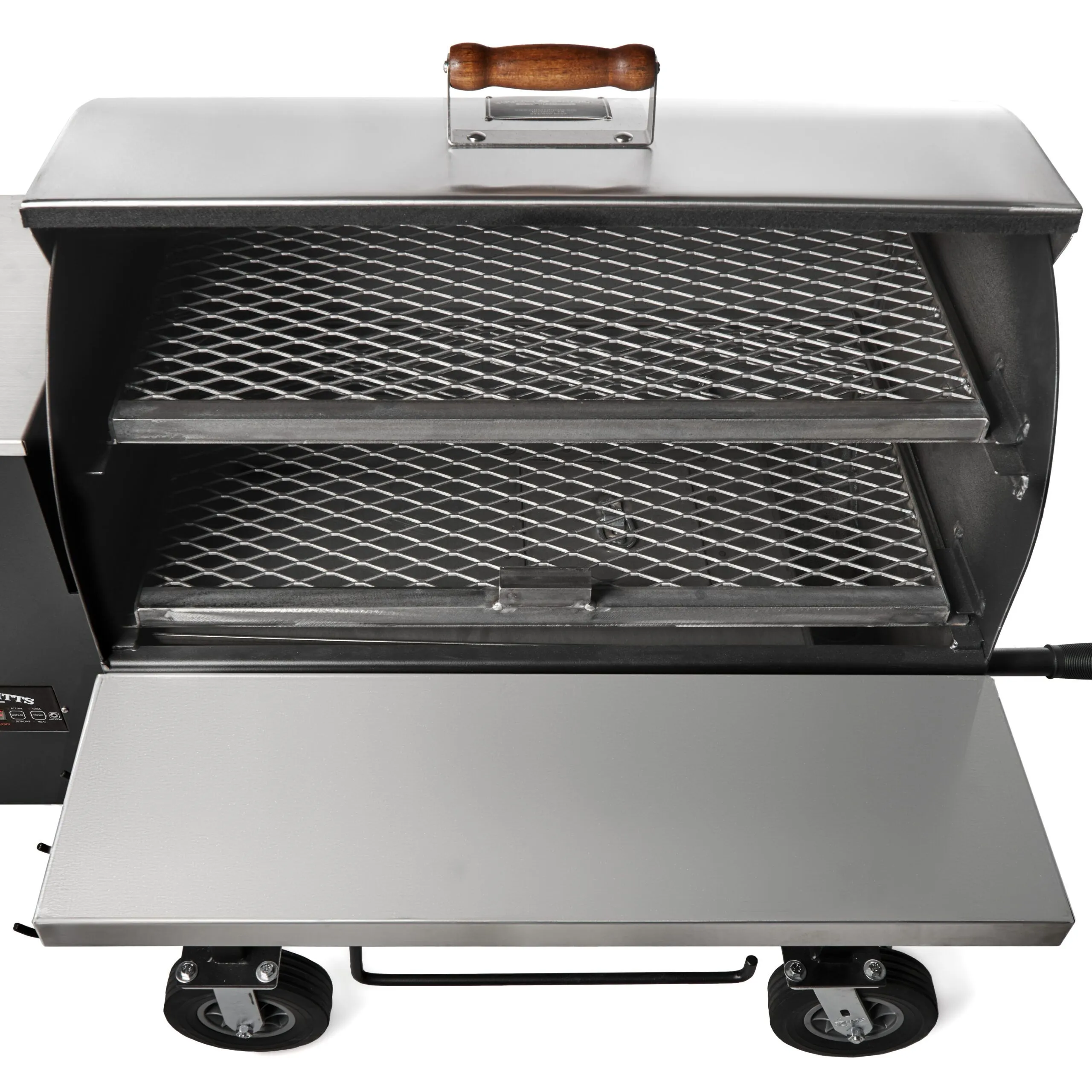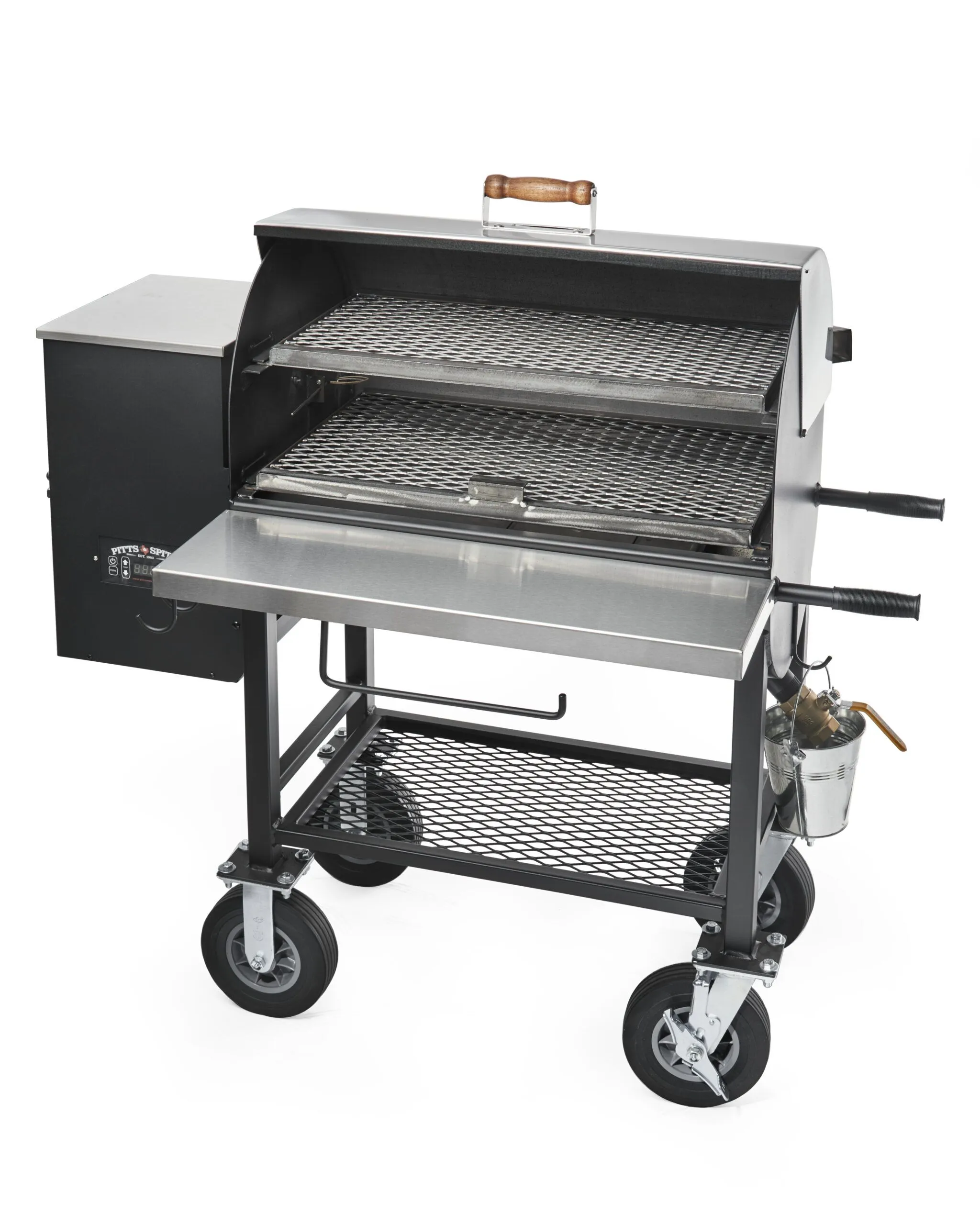 The carbon steel cooking chamber is made of 7 and 10 gauge carbon steel. This grill comes standard with our signature 304 stainless steel lid and work shelf.
